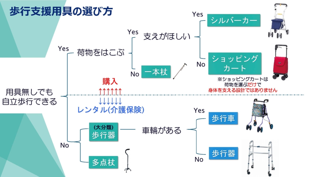 歩行支援用具は、単に「歩けないから使う」のではなく、「どの程度歩けるか」「どんな使い方をしたいか」「認知や筋力の状態」によって選ぶことが大切です。