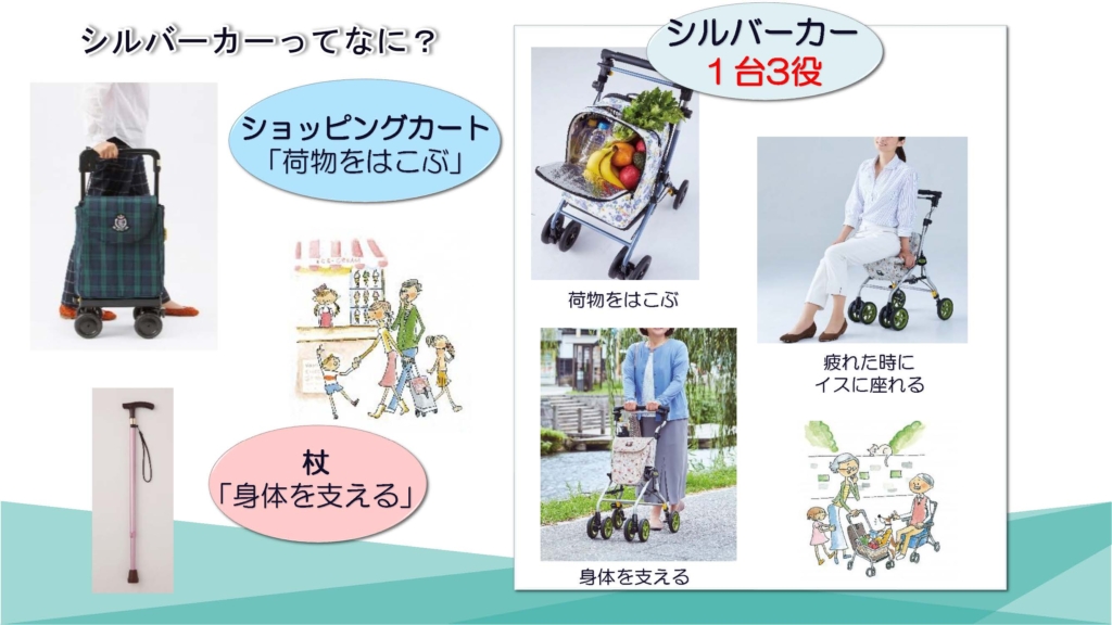 「シルバーカー」は、いわゆる手押し車の一種で、主に自立歩行が可能な高齢者が屋外で使うことを想定した歩行支援用具です。