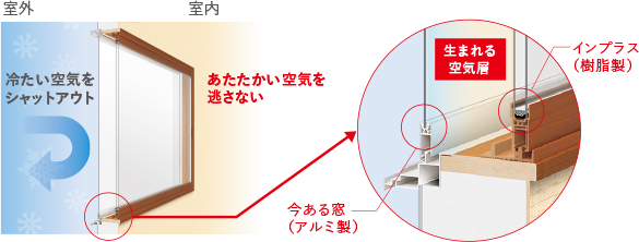 今ある窓の内側に新しい窓を取り付ける“二重窓”構造で、窓と窓の間に空気層が生まれ、外気の熱をしっかり遮断してくれます。