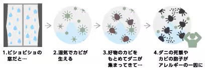 冬場、窓ガラスがびっしょり濡れていた経験はありませんか? インプラスは断熱性能が高いため、室内外の温度差による結露を抑えることができます。結露が減ることで、カビやダニの発生も抑制され、アレルギー対策にもつながります。
